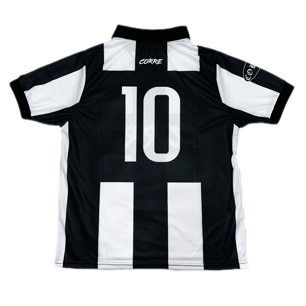 Gola polo retrô, tecido colmeia com excelente caimento, listrada preta&branca e escudo patch bordado. Nas costas número 10 e logo da Corre.