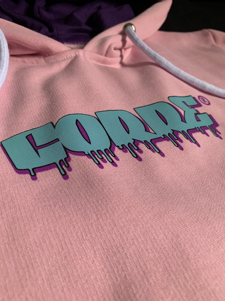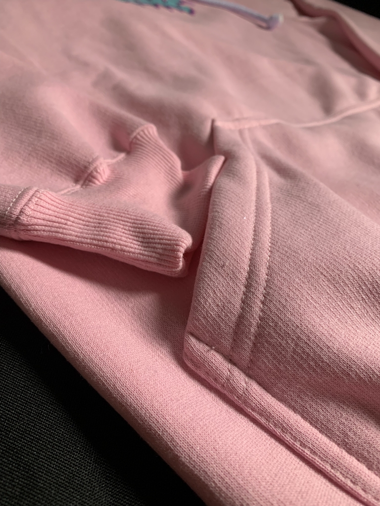 Moletom canguru rosa, estampa em verde e roxo alto relevo, logo nas costas inferior, etiqueta de cetim costurada e qualidade das ruas!